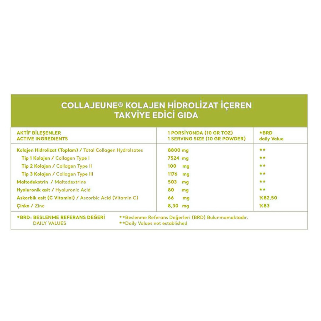 With its generous content of 8,800 mg collagen peptide in its formula, it provides the Type 1, Type 2 and Type 3 collagen amounts needed daily.